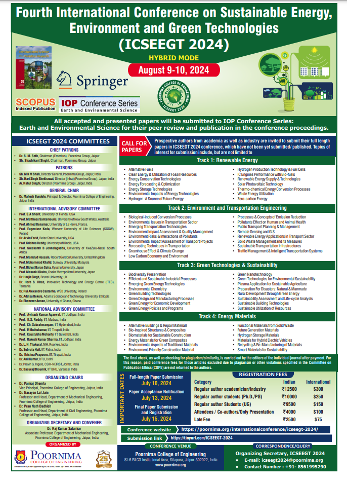 The Fourth International Conference on Sustainable Energy, Environment, and Green Technologies (ICSEEGT 2024), to be organized at Poornima College of Engineering, Jaipur, Rajasthan, India, is a great platform for researchers around the globe to discuss and present their research findings, share insights, and collaborate. The scope of the conference includes renewable energy, environment and transportation engineering, green technologies and sustainability, and energy materials as major themes due to their international significance in the present era. With a specific focus on green growth, the conference aligns well with the global imperative of pursuing economic development while ensuring environmental sustainability. Green growth not only addresses the pressing challenges of climate change and resource depletion but also facilitates the improvement of living standards, access to modern energy services, and the efficient use of energy resources. The multidisciplinary nature of the conference, involving academia, government agencies, research laboratories, and the corporate sector, enhances the potential for addressing holistic and comprehensive solutions to complex issues. The key benefits and outcomes of the conference may include opportunities for knowledge exchange, demonstrating innovation and research, networking and collaboration, capacity building, awareness and advocacy, and global perspective. In conclusion, ICSEEGT 2024 is composed to play a crucial role in advancing research, knowledge sharing, and collaboration opportunities in the domains of sustainable energy, environment, and green technologies and hence contributes to the collective effort towards achieving green growth and a sustainable future.
