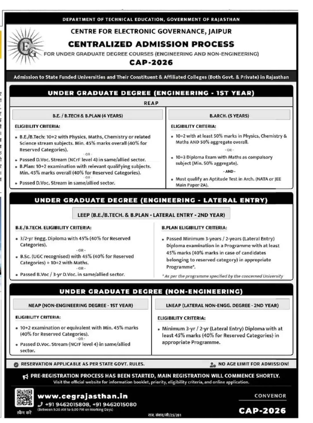 The Centre of Electronic Governance is conducting REAP 2026 for the admission of candidates to B.Tech 2026 program on the basis of JEE (Mains 2026) score & Scaled Percentage/ Percentile in class 12th Science Maths.