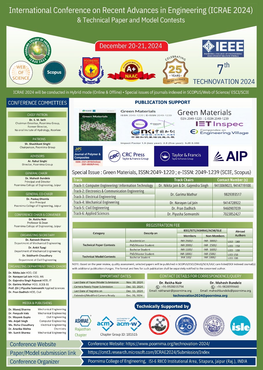 7 th Edition of the conference cum contests, Technovation 2024 is a combination of Third International conference on “Recent Advances in Engineering” along with 7 th Technical Paper and Model Contests. TECHNOVATION-2024 will be jointly organized by IEEE Student Branch Poornima College of Engineering, Jaipur and professional society chapter such as ISTE, ASHRAE, ISHRAE, ACM-W student chapters during 20-21 December 2024. In the previous two editions of Technovation, the event was organized as International Conference and contests. Six editions of Paper & Model Contests have been already organized and selected good quality papers were published in UGC and SCOPUS indexed journals.The first Conference received publication support of Taylor & Francis and the second conference received publication support of SCOPUS Indexed Journals under Scientific.net and Web of Science indexed Journal of Poymer & Composites (SCIE). ICRAE 2023 also received a publication support from ESCI Journal, Frontiers in Mechanical Engineering. This year’s edition also has been upgraded as International level with a separate conference track in each domain. The main purpose of this conference cum contests is to attract the researchers, doctoral students, master students and undergraduate students from various streams to bring them together to represent their talents, innovative ideas in the technological advancement and to learn the latest trends in the field of engineering across the globe. This conference cum contests involves the oral presentation of research articles, review papers; technical notes, proposal for doctoral and masters work etc and demonstration of models thereby showcase original contributions and innovative ideas of undergraduate, post graduate and doctoral students from various institutions and streams all across the world. Beyond the student's contributions, a good number of keynote speeches in the various fields of engineering and technology like electrical engineering, electronic and communication engineering, computer engineering, information technology, mechanical engineering and civil engineering will be arranged for the participants to keep them updated with recent advances in science, engineering and technology. Technovation-2024 is an effort to gather a group of intellectuals from all over the world under one roof with prominent dignitaries to provide perspectives on the potential of ongoing research work and to exchange their ideas. It also aims to create new opportunities for collaboration to conceive and execute new ideas. The conference cum contest is divided into six parallel tracks. Participants can submit and exhibit their projects, working models, technical posters and their articles. Best projects, working models, and the articles in each technical field will be awarded through an evaluation process by the technical review committee. The best papers and models in each technical field will receive awards. Beyond that, selected papers will be published in ISBN proceedings. Good Quality papers will be published in Scopus indexed journal with additional charges. This additional charge will depend on the type of journal and article processing fee of the particular journal. The themes for Paper and model are the same.
